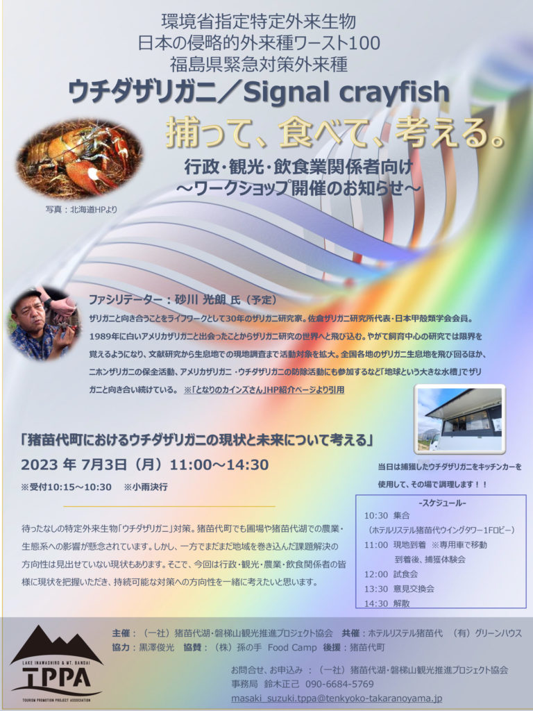 7月3日(月)猪苗代町において特定外来生物「ウチダザリガニ」について考えるワークショップを当協会主催で実施しました。